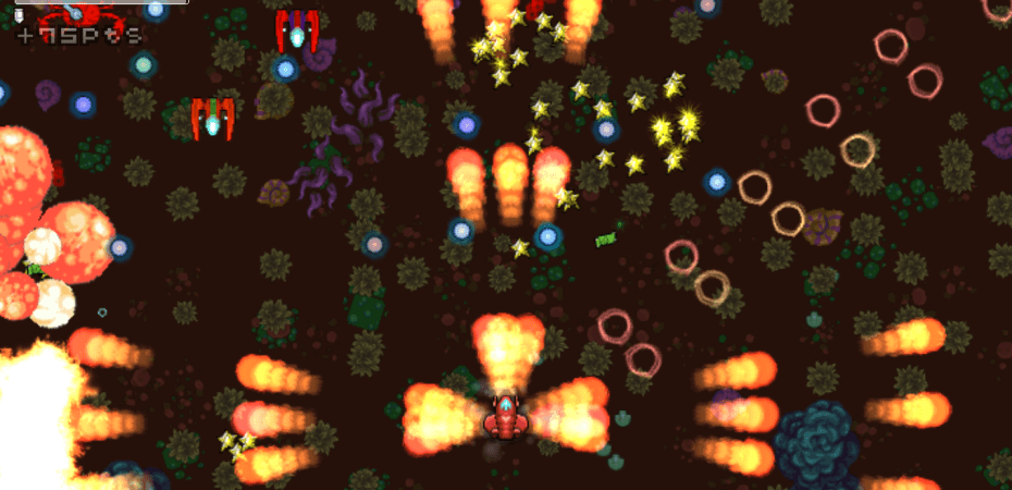 *+ The particle effects go away from the projectile and when an enemy explodes the particles too go away from the projectile. This is to keep the screen relatively clean in a game that’s just full of stuff.