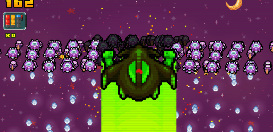 Here comes a new power up… without the ability to shoot came the inspiration of the star wipe. For ten or so seconds your ship increases in size, becomes invincible and lets you plow through enemies. Even bosses get wrecked from the might of the star wipe! Its a great new power up and different than the rest that do things such as double your damage, double your defense, increase your firing rate and so on.