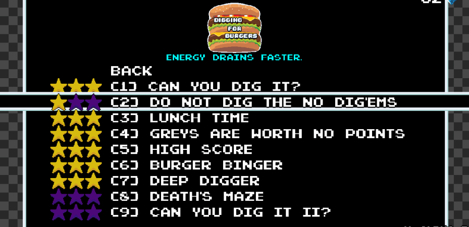 Each challenge tweaks the game in simple ways and gives you goals for the sake of diversity. Some of the tweaks are removing or adding collectables, fast draining or recovering energy, adding grey blocks that give 0 points, increasing or decreasing death blocks and other interesting things. The goals include breaking X number of blocks, getting to a specific depth, collecting Y number of burgers, surviving X number of minutes and even obtaining a specific score.