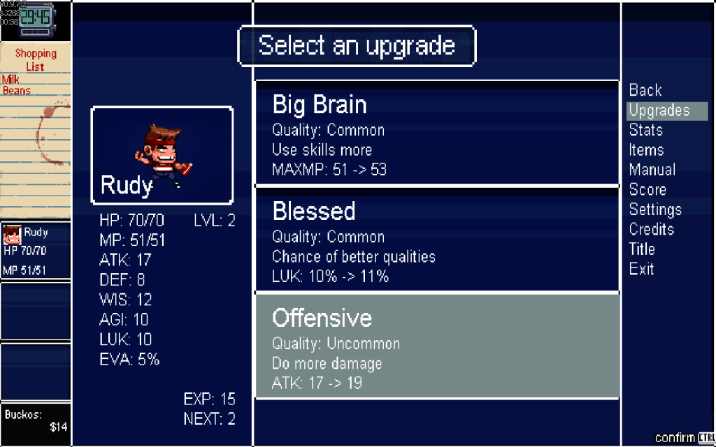 These upgrades are optional, at least so far. The player gets a hint after Rudy’s first level-up that upgrades exist, but the player still has to go into the upgrade menu to get the choice. Perhaps there should be an achievement for not using an upgrade.